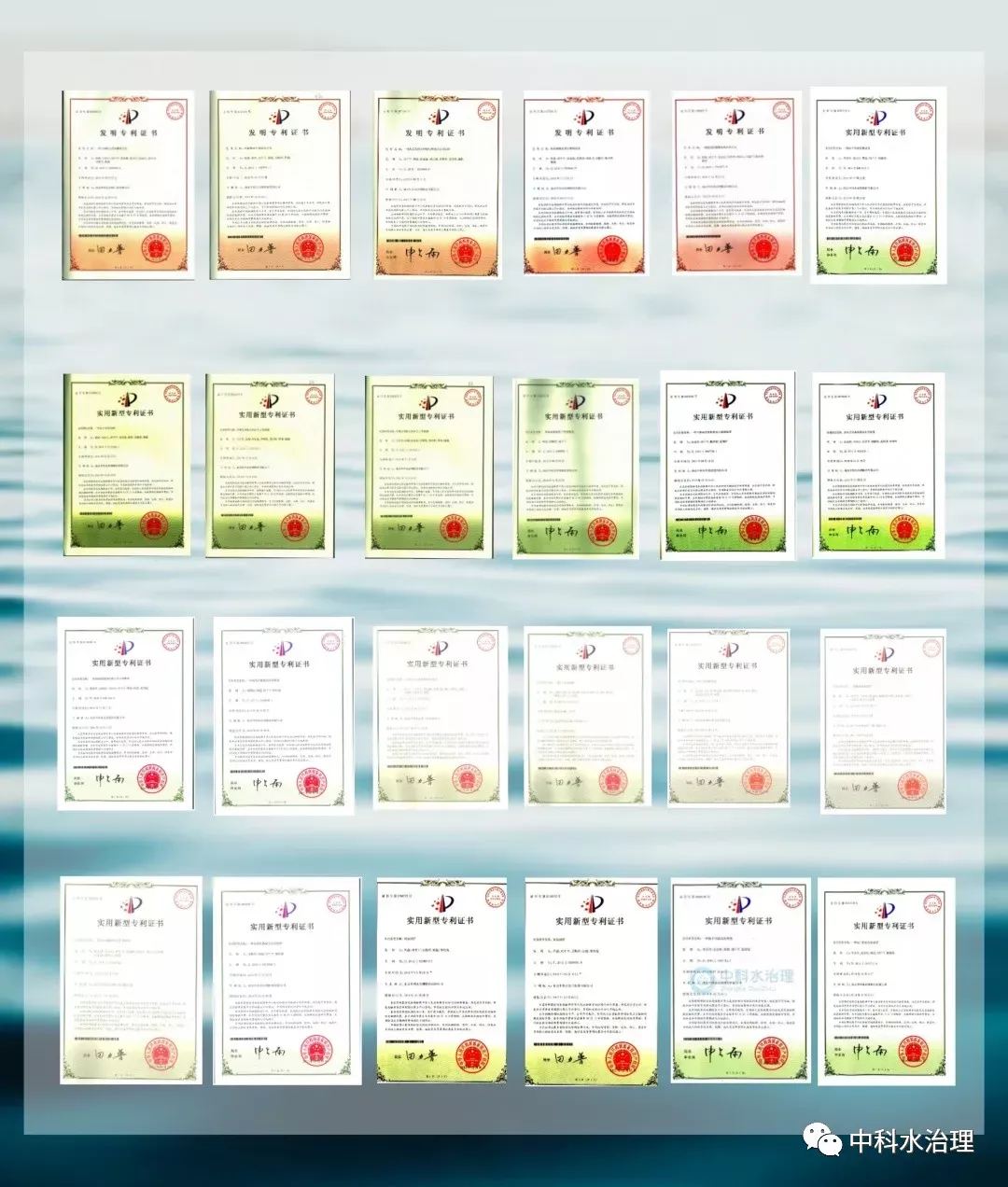 2011年,中科水治理獲得國家“高新技術企業”認證,完成股份制改造,中科院成為公司第二大股東。上圖為公司獲得過的多項專利證書。