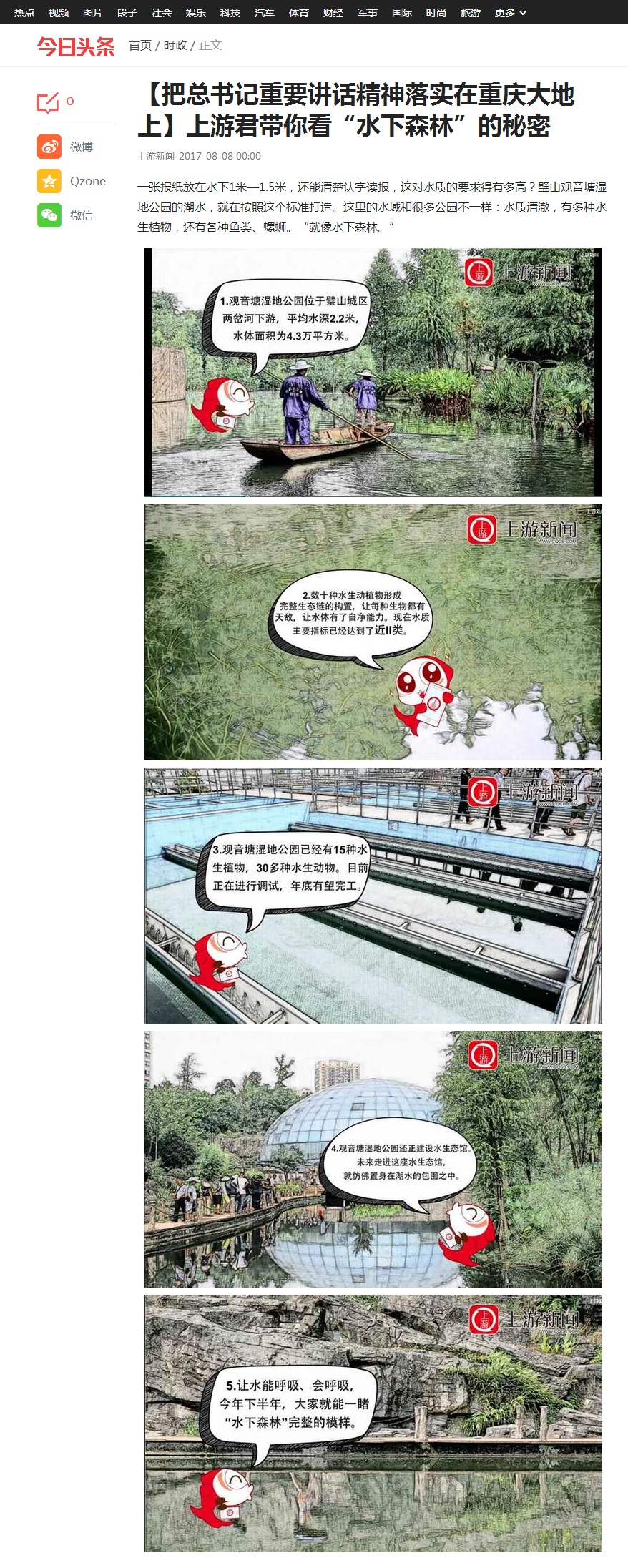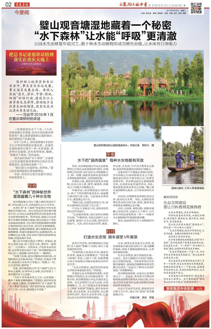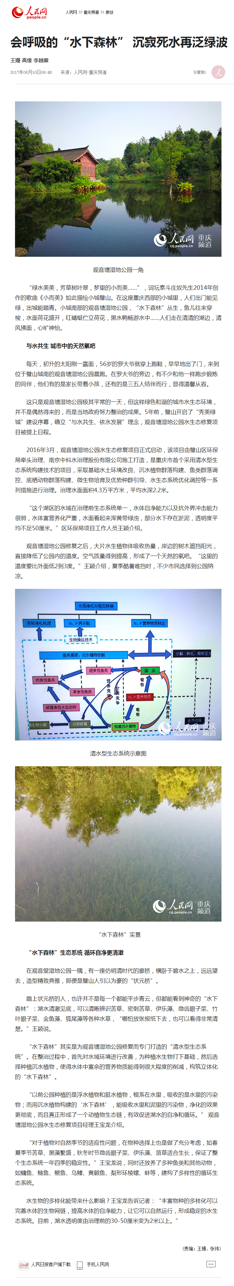 重慶日報、重慶之聲、重慶電視臺、重慶晚報、重慶晨報、重慶商報、華龍網(wǎng)、《當代黨員》雜志社等市級主流媒體記者,來到觀音塘濕地公園,實地探訪了“水下森林”建設(shè)情況,采訪了項目設(shè)計施工單位【南京中科水治理股份有限公司】工作人員。觀音塘濕地公園項目是由中科水治理傾力打造的精品水生態(tài)修復(fù)項目,也是重慶市首個生態(tài)文明建設(shè)示范基地。