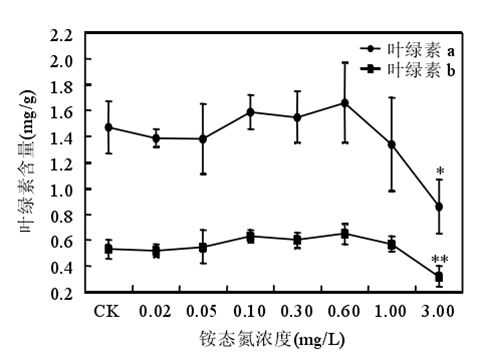 銨態(tài)氮濃度低于 0.60mg/時苦草生長良好,濃度大于或等于 1.00mg/L 時苦草的光合能力受到抑制、代謝受到干擾。苦草對銨態(tài)氮最敏感的生理生化指標(biāo)是葉片中游離氨基酸態(tài)氮含量。銨態(tài)氮作為沉水植物的一種營養(yǎng)物質(zhì),當(dāng)其含量較低時,植物由于營養(yǎng)缺乏誘導(dǎo)產(chǎn)生自由基。