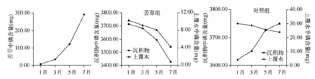 苦草對水體營鹽的去除率隨生物量的增加不斷增大,當(dāng)生物量達(dá)到 2380.00g時,去除率放緩。苦草腐敗釋放的磷大部分被底泥吸附,少量進(jìn)入水體。草腐敗分解具有階段性,前36d分解迅速,以后分解速率顯著下降。