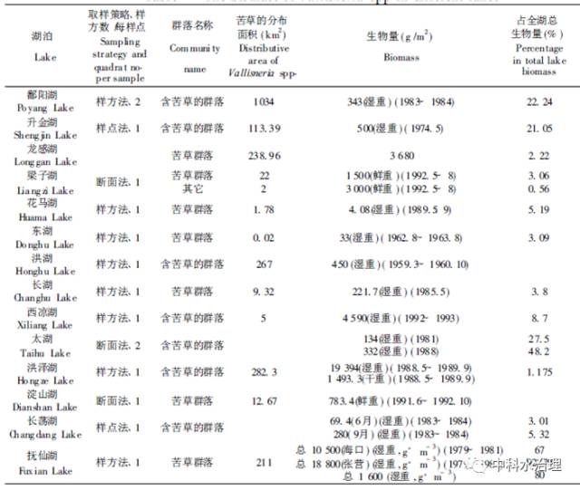 在很多湖泊植被調(diào)查工作中都對苦草群落或含苦草的群落生物量進(jìn)行了測定(見下圖)。從表中可以看出,最高和最低生物量之間存在上千倍的差異。這一方面是因為調(diào)查對象尚包括其它種類,而非苦草本身; 另一方面,也是由于調(diào)查方法本身所致: