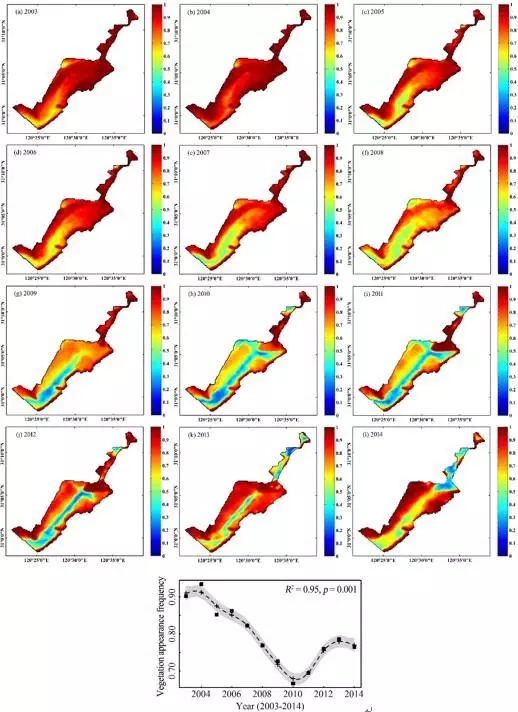 2003-2014年?yáng)|太湖水生植物出現(xiàn)頻次空間分布和長(zhǎng)期變化